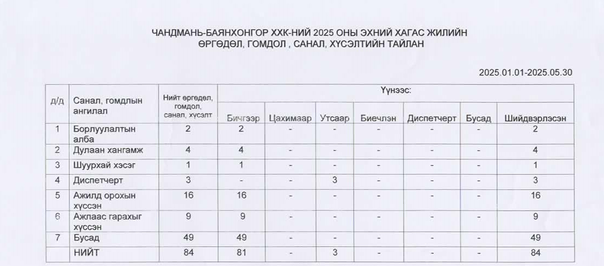 Бичгээр болон цахимаар ирсэн өргөдөл, гомдлын шийдвэрлэлтийн тайлан
