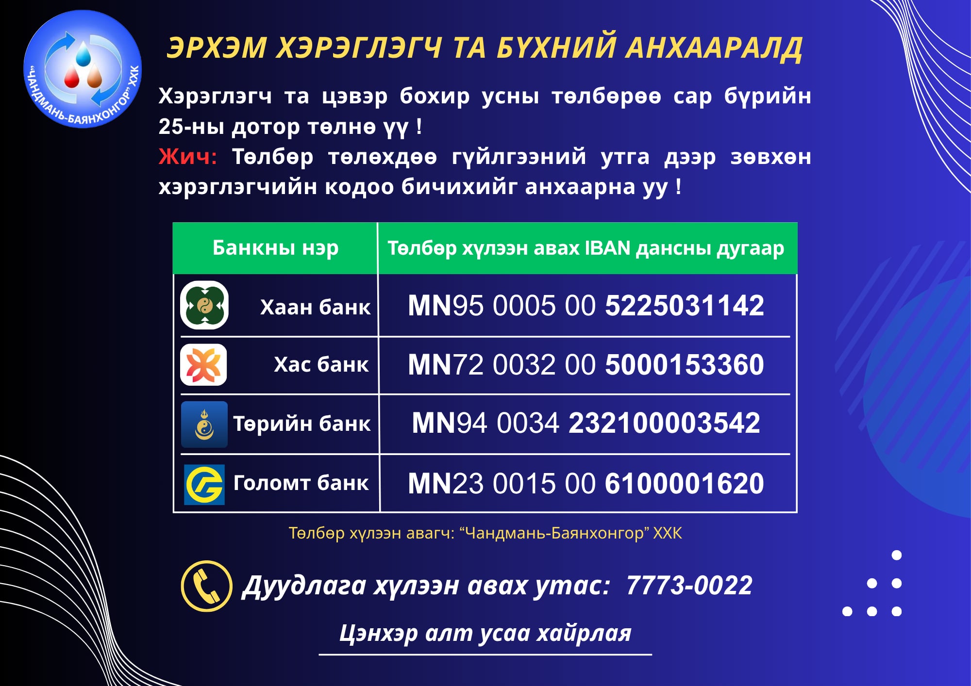 Усны үйлчилгээний төлбөр төлөх, дансны дугаар